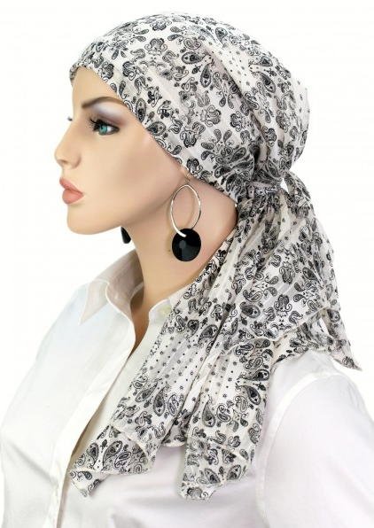【おしゃれな医療用帽子・ケア帽子】裏地は頭皮にやさしいオーガニックコットン100% 肩までカバー・ロング丈・スカーフ・キャップ アイボリー×ペイズリー柄(S692)/アメリカ製