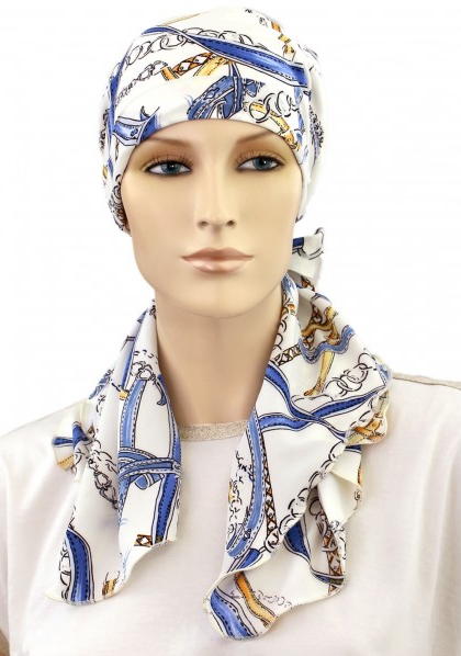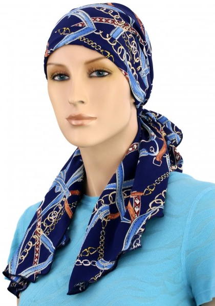 【おしゃれな医療用帽子・ケア帽子】裏地は頭皮にやさしいオーガニックコットン100% 肩までカバー・ロング丈・スカーフ・キャップ ブルー×ベルト&チェーン柄(S753)/ アメリカ製