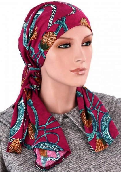 【おしゃれな医療用帽子・ケア帽子】裏地は頭皮にやさしいオーガニックコットン100% 肩までカバー・ロング丈・スカーフ・キャップ ワイン×チェーン柄(S754)/ アメリカ製