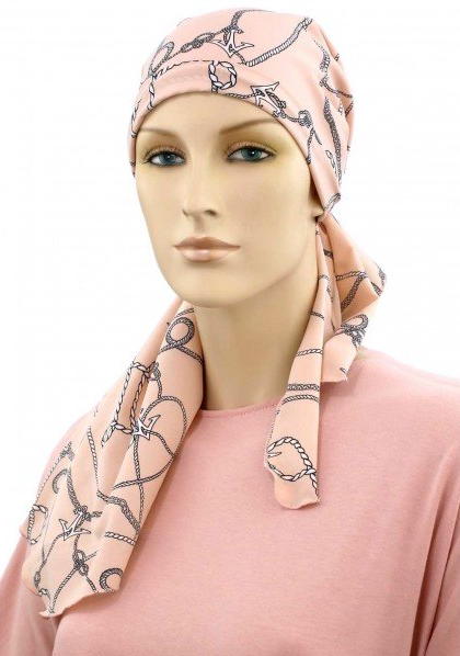 【おしゃれな医療用帽子・ケア帽子】裏地は頭皮にやさしいオーガニックコットン100% 肩までカバー・ロング丈・スカーフ・キャップ コーラルピンク×ロープ柄(S755)/ アメリカ製