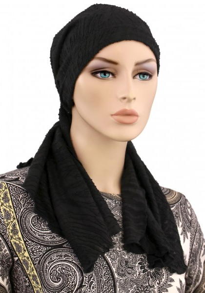 【おしゃれな医療用帽子・ケア帽子】裏地は頭皮にやさしいオーガニックコットン100% 肩までカバー・ロング丈・スカーフ・キャップ ブラック・ジャカード(S756)/ アメリカ製