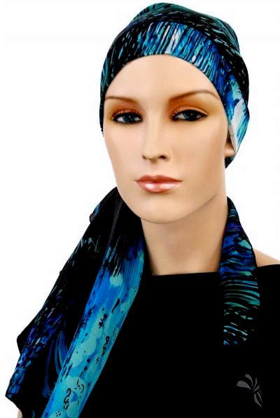 【医療用帽子・ケア帽子】後ろまでカバーされているイタリア製シルク100% スカーフ・キャップ ブラック×ブルーオーシャン(S332)/ アメリカ製