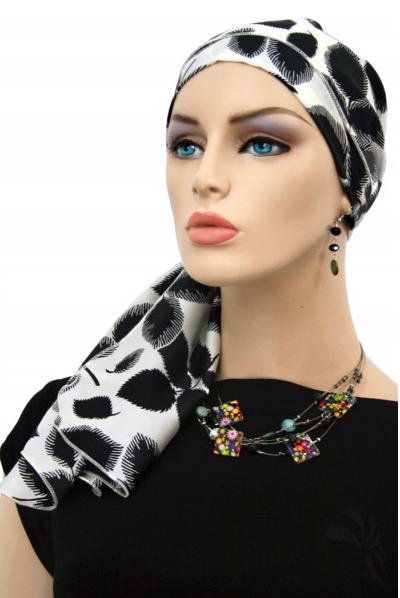 【医療用帽子・ケア帽子】後ろまでカバーされているイタリア製シルク100% 肩までカバー・ロング丈・スカーフ・キャップ リーフ柄(S437)/ アメリカ製