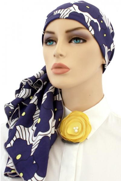 【おしゃれな医療用帽子・ケア帽子】後ろまでカバーされているイタリア製シルク100% スカーフ・キャップ ネイビー・デイジー(S622)/ アメリカ製