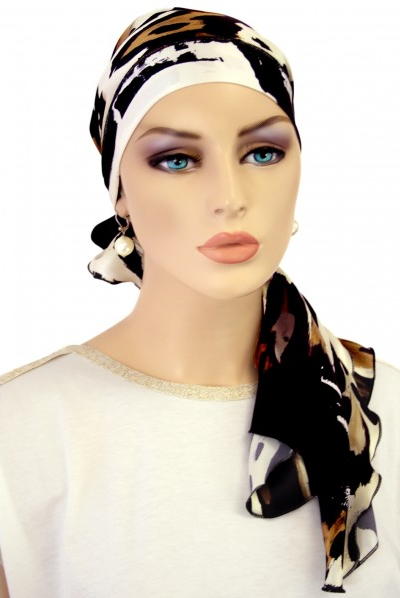 【おしゃれな医療用帽子・ケア帽子】後ろまでカバーされているイタリア製シルク100% スカーフ・キャップ ブロック✕ブラウン(S623)/ アメリカ製