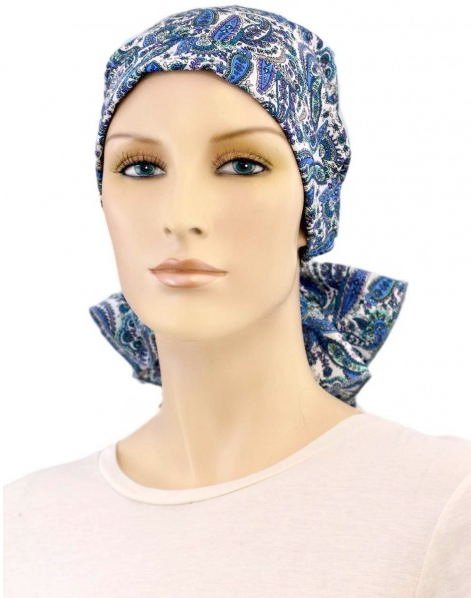 【おしゃれな医療用帽子・ケア帽子】裏地は頭皮にやさしい柔らかなオーガニックコットン100% ショート丈・スカーフ・キャップ ブルー・ペイズリー柄(S722)/ アメリカ直輸入
