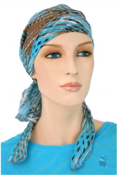 【おしゃれな医療用帽子・ケア帽子】裏地は頭皮にやさしい柔らかなオーガニックコットン100% ショート丈・スカーフ・キャップ ブルー×ブラウン(S257)/ アメリカ製