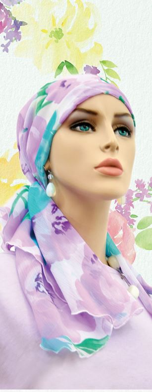 【医療用帽子・ケア帽子】裏地は頭皮にやさしいオーガニックコットン100% 肩までカバー・ロング丈・スカーフ・キャップ ライラック・フラワー柄・ラベンダー(S282)