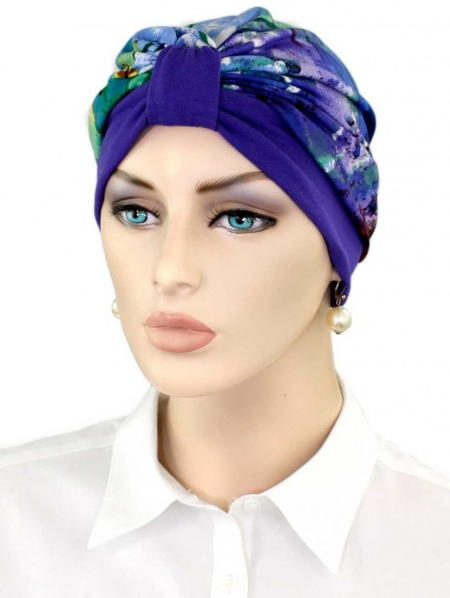 【おしゃれな医療用帽子・ケア帽子】ターバン・キャップ パープル×マルチカラー(S746)/アメリカ製