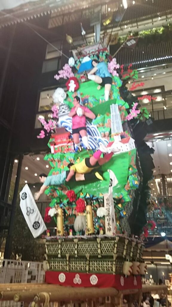 今年の秋は 福岡でラグビーのワールドカップが開催されるのでラガーマンをモチーフにした飾り山が印象的でした。(写真がブレてすみません)