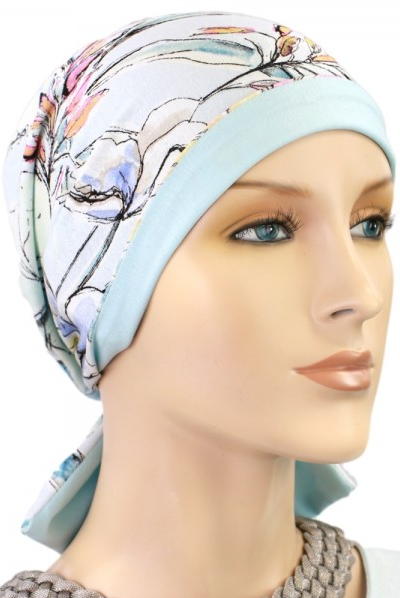 【おしゃれな医療用帽子・ケア帽子】ミニリボン付きリバーシブル・キャップ フラワー(ユリ)柄×スカイブルー(S630)/アメリカ製