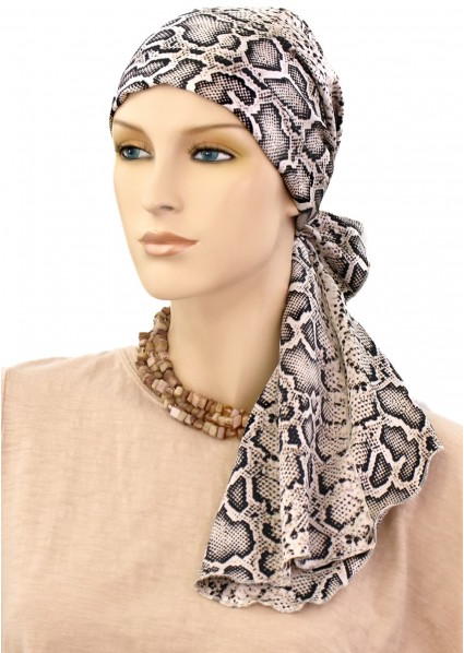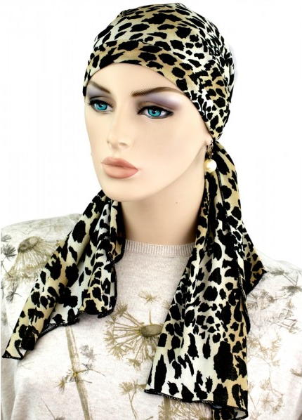 【おしゃれな医療用帽子・ケア帽子】裏地は頭皮にやさしいオーガニックコットン100% 肩までカバー・ロング丈・スカーフ・キャップ 光沢のあるアニマル柄(S769)/ アメリカ製